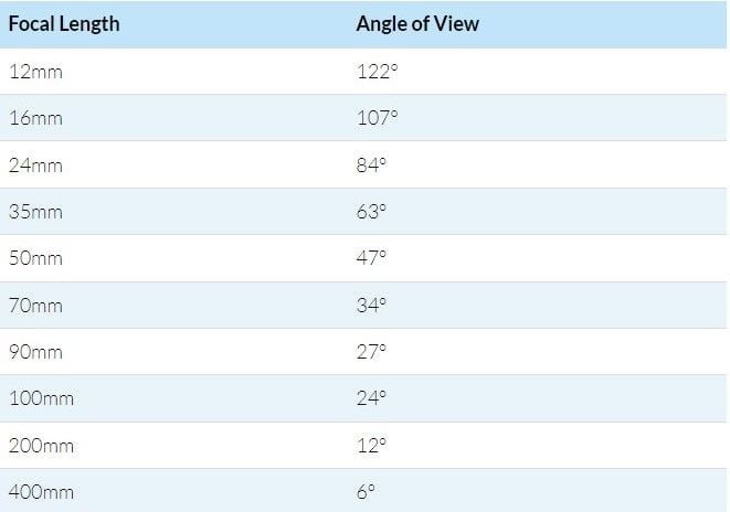 Bạn có thể tham khảo bảng hiển thị góc xem cho các ống kính có độ dài tiêu cụ phổ biến.